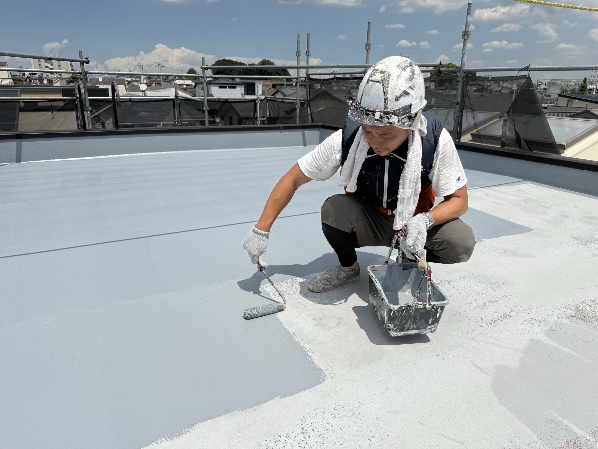 陸屋根FRPの遮熱トップコート作業中