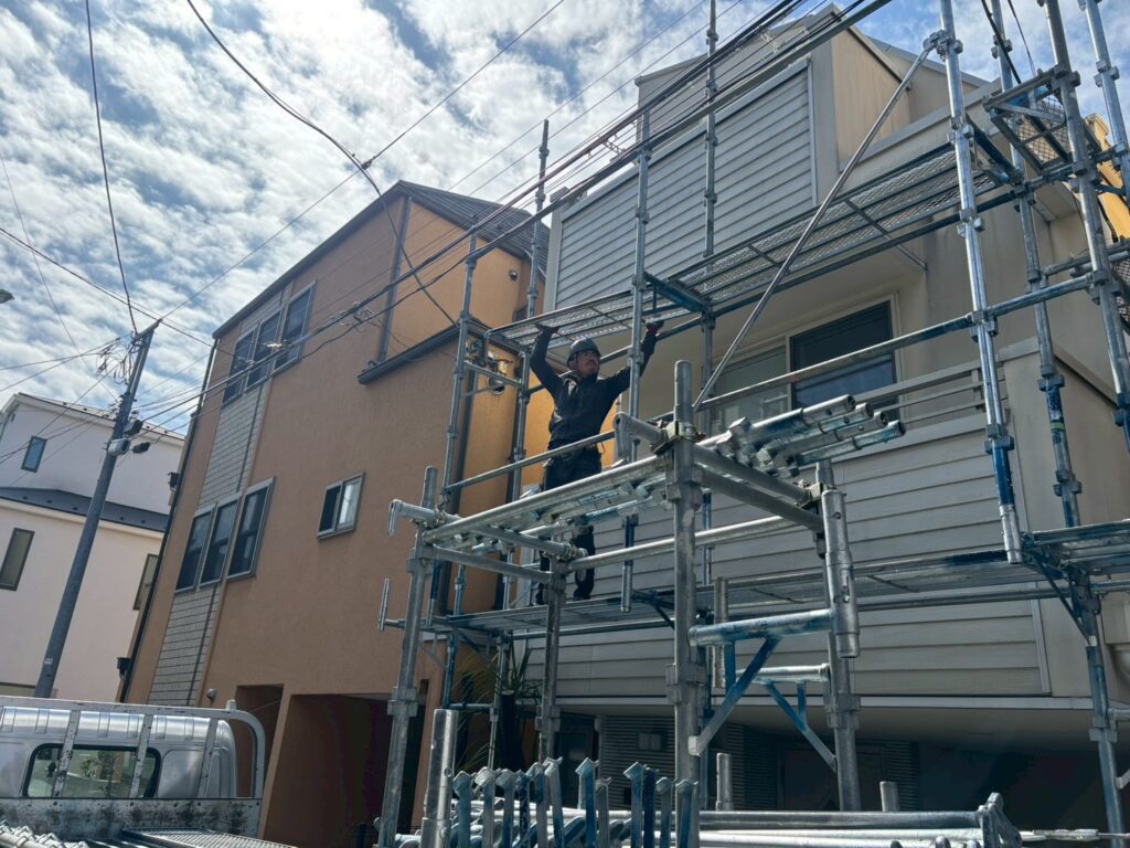 近隣との距離も近い住宅街のため、安全面・作業性をしっかり確保するために、足場の設置は特に重要な工程になります。